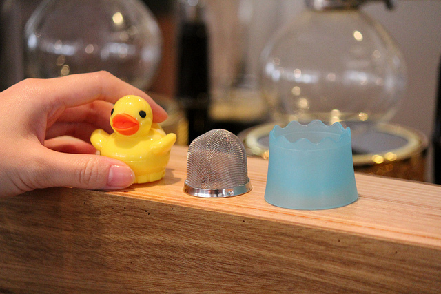 黃色小鴨沖茶器 ,從左至右,小壓本體、濾網、乘座。