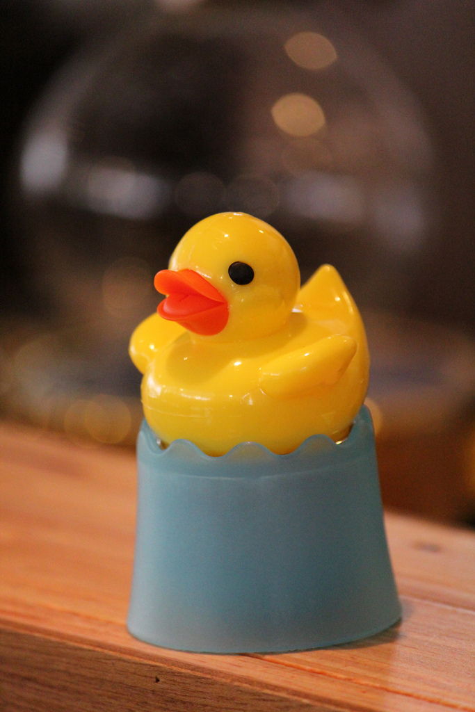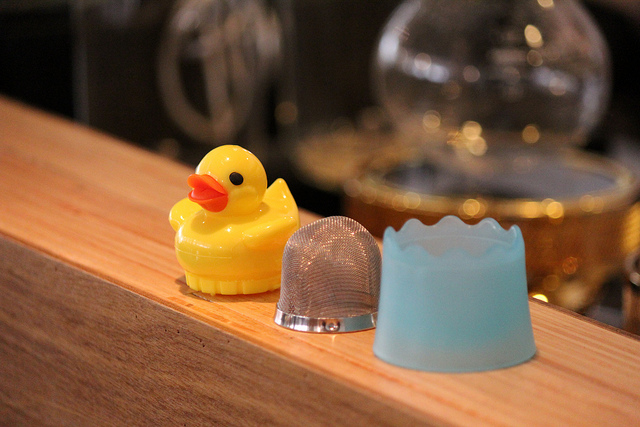 簡單的設計卻充滿著巧思,以鴨子划水的概念,在黃色小鴨的下方加裝了金屬濾網,讓茶葉可以在裡面浸泡,再附上個蛋殼狀的承座,讓泡完茶湯的小鴨能夠安穩的在上面休息。