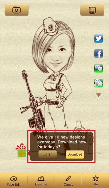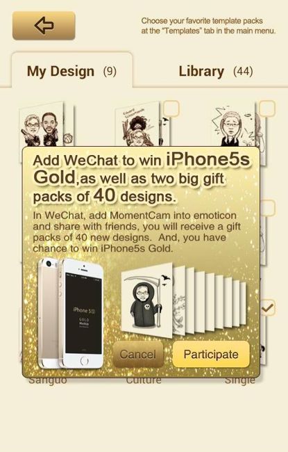 還有好康呈獻給WeChat 親愛的用戶們!Android版魔漫相機用戶,當漫畫圖片完成設計之後,可點選手機返回按鈕,即會跳出抽獎活動頁,點選「參與」,依照說明完成與WeChat連結,就可參加現下最搶手的金色iPhone 5s抽獎活動!「我的背景」中還將會多出兩組40個專屬範本集;若從WeChat將魔漫相機加入至應用功能列並分享至WeChat或朋友圈,也可得相同大禮喔!大家可快速進入魔漫相機資料庫內,找尋自己最喜愛、或是裝扮平日不敢大膽變裝的漫畫角色,分享給周圍好友!即日起更加碼,每天只要打開魔漫,就能獲得10組不同的範本,日日不重複、天天有新圖喔!快讓朋友們羨慕一下!當然,WeChat iOS用戶也在近期內能享受到同樣的禮遇!敬請期待!