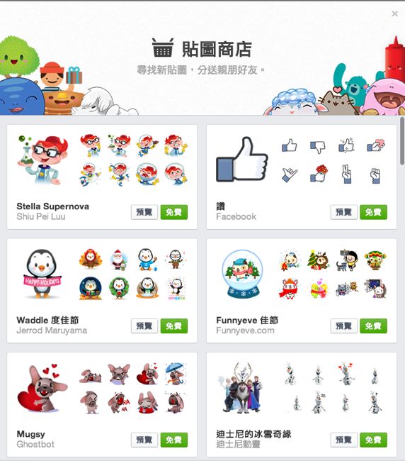 其實Facebook的貼圖商店中不僅只有標準手勢可以下載,還有多款免費的貼圖包不斷的更新提供給使用者下載。例如超可愛的Pusheen貓咪就有三款系列貼圖,還有candy crush 系列、草泥馬、Pandadog 和神偷奶爸等等,喜歡用貼圖表示心情的朋友終於可以盡情的下載來更準確地向對方表達出情緒了喲!