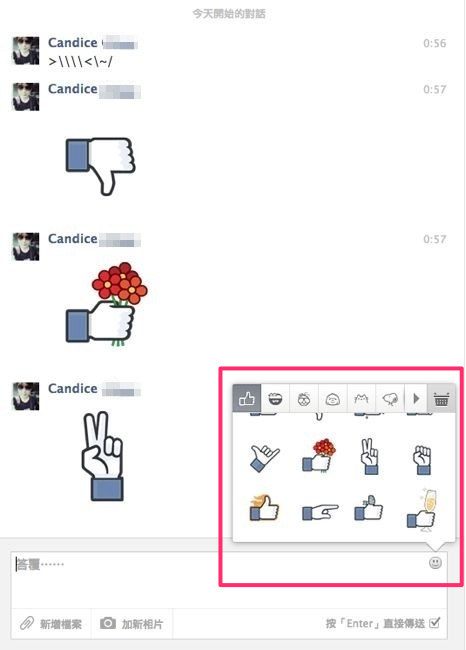 等到快速的下載完成,日後和好友的對話訊息中就能夠盡情地使用。不論是想要比讚、比爛、送花、敬酒通通都能透過Facebook的標準手勢來表示。