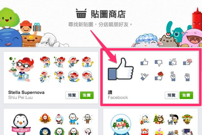 原來只要在Facebook訊息中的圖案圖示,就能看見購物車的符號,這也就是讓我們來下載可愛貼圖用的圖示。點進去後便能看見貼圖商店中那”讚”的免費貼圖包,此時二話不說開始下載!