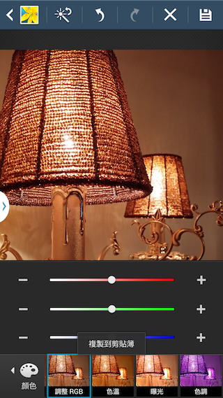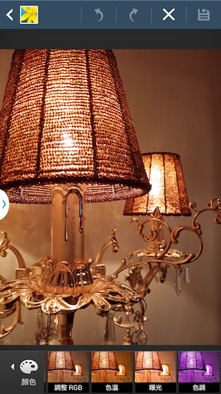 是不是有點眼花繚亂,GALAXY J 就是提供了這麼多樣化的濾鏡供使用者使用。GALAXY J 搭配了1300萬畫素的相機,整體畫質也有不錯的表現,所以除了濾鏡之外,也提供了一些簡單的照片編修給對照片要求更多的使用者使用,除了一般的裁切,對比度之外,GALAXY J 還能將RGB三色分開調整,你沒有看錯,內建的編修就已經有這麼細部的調整,所以除了喜愛用濾鏡拍攝的朋友外,較要求照片的朋友也能輕鬆透過相機自帶的編修功能做調整。