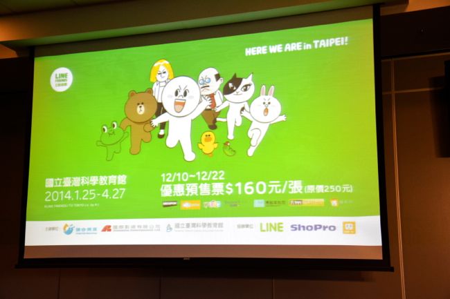 這場全球首場的LINE展覽-“HERE WE ARE-LINE FRIENDS 互動樂園”,由聯合報系、國際影視共同為LINE Friends 打造四大主題:”哈囉台北“、”原創角色“、”原創手稿“與”LINE世界“。讓LINE中九大角色:熊大、兔兔、饅頭人、詹姆士、老闆、莎莉、潔西卡、雷納德與愛德華跳出螢幕與大家近距離的接觸。
