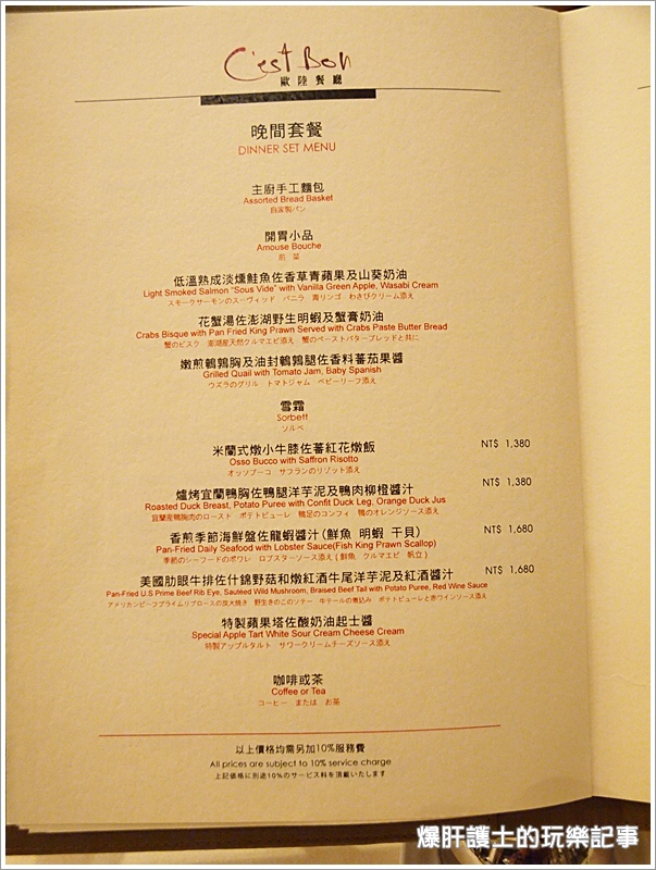 搭配住宿提供的$1380牛膝與鴨胸兩種套餐,也可以加價選其他套餐。