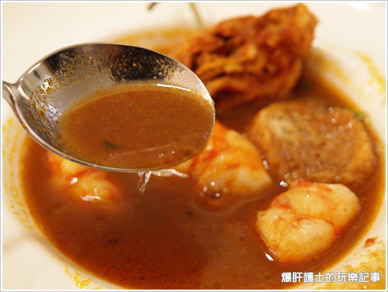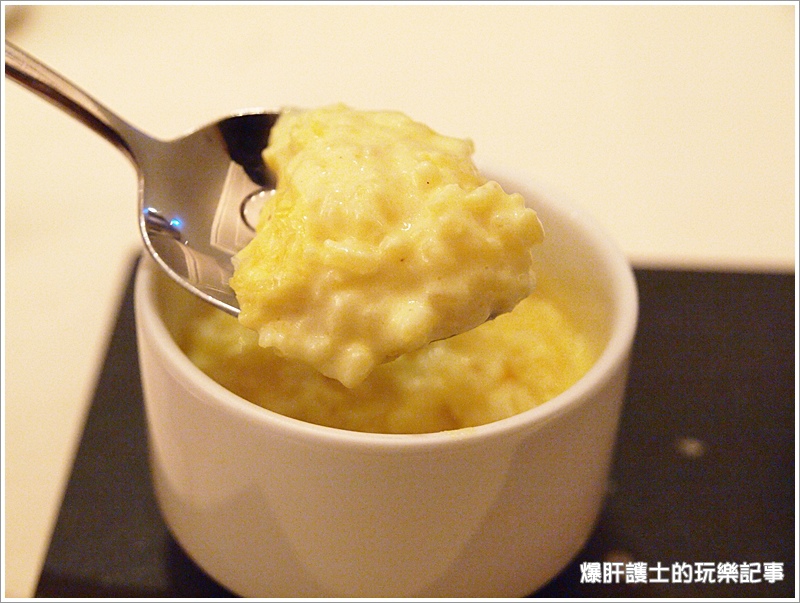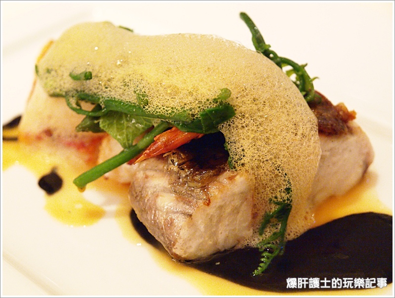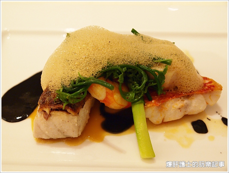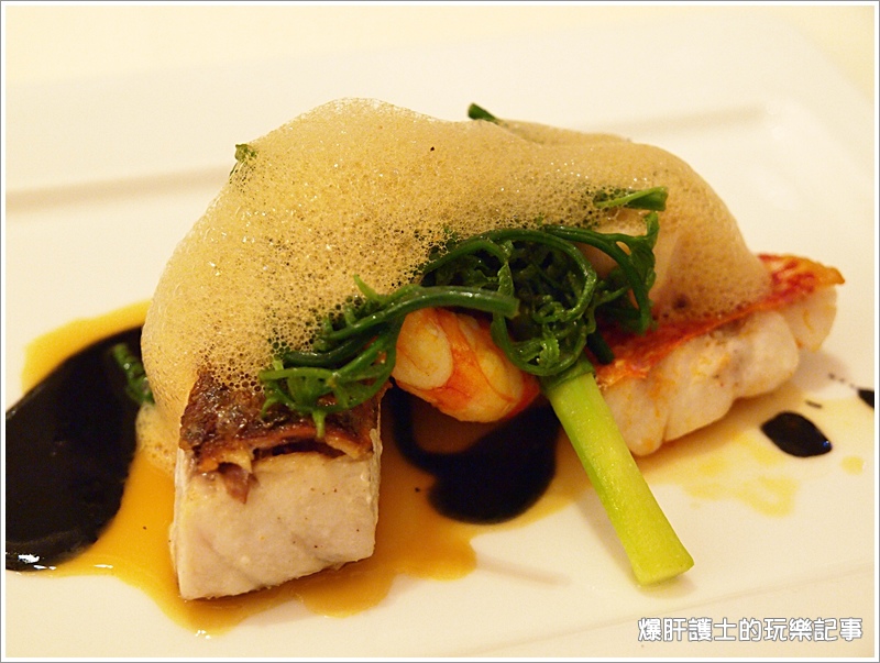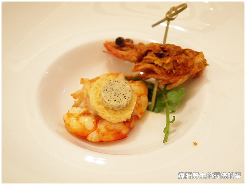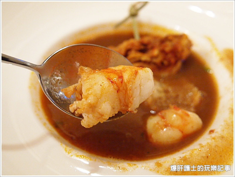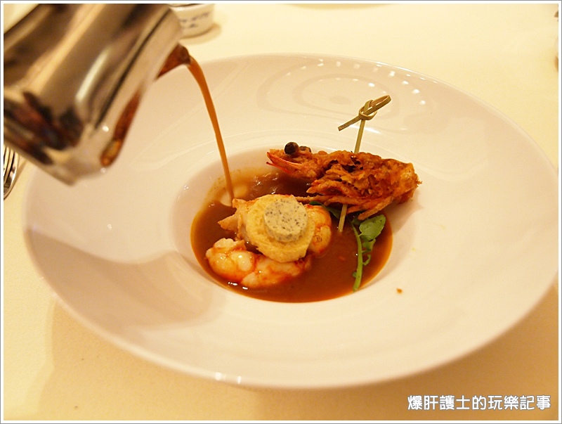 這一到花蟹湯最為驚豔,上頭像芝麻的是蟹膏奶油,要混在湯裡頭喝,上桌後服後人員才倒入熱湯,這一道看不到蟹肉與蟹身,卻可以聞到蟹香、食到蟹味,相較之下澎湖野生明蝦只是點綴物。