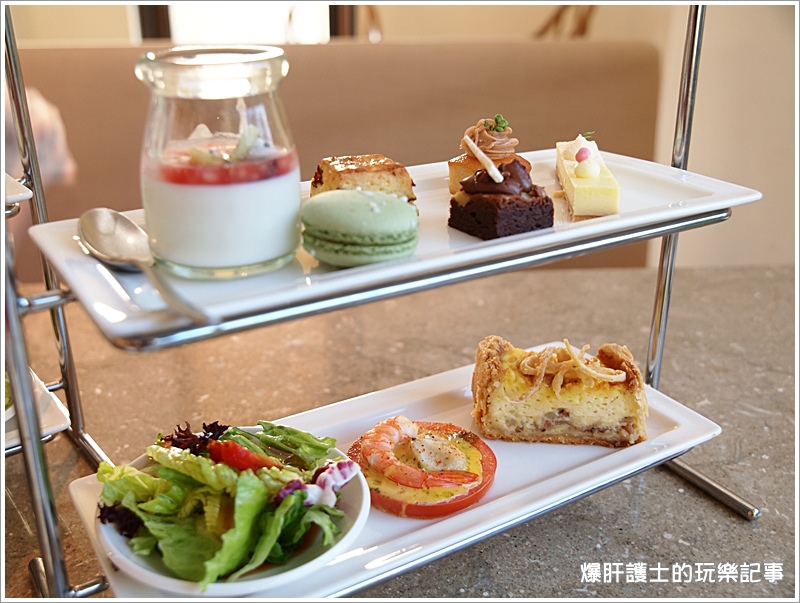 下層是法式鹹派、沙拉、鮮蝦干貝塔。