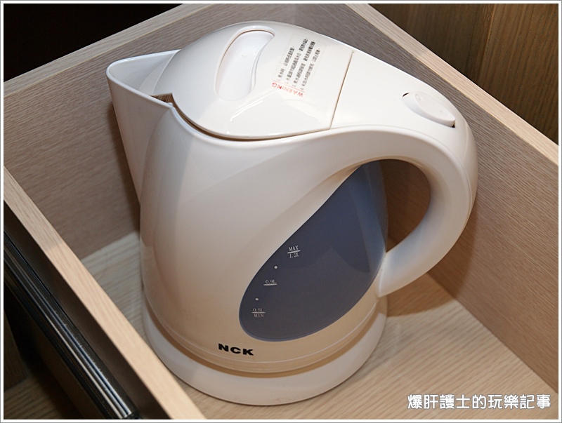 冰箱裡頭的都是免費的,連同冰箱的水,這裡一共提供6瓶罐泉水,不夠喝的貴賓室還有一大堆可以取用,這罐泉水不大不小,很方便隔天出遊時帶在袋子裡以防口渴之需。下頭還有煮水的茶壺。