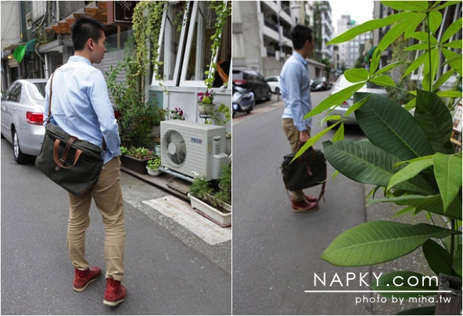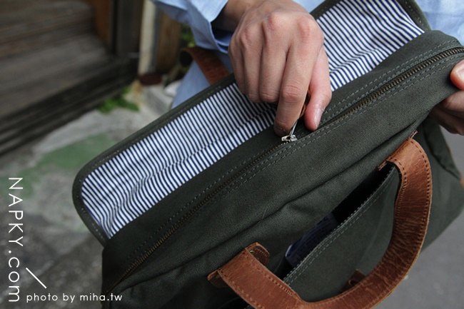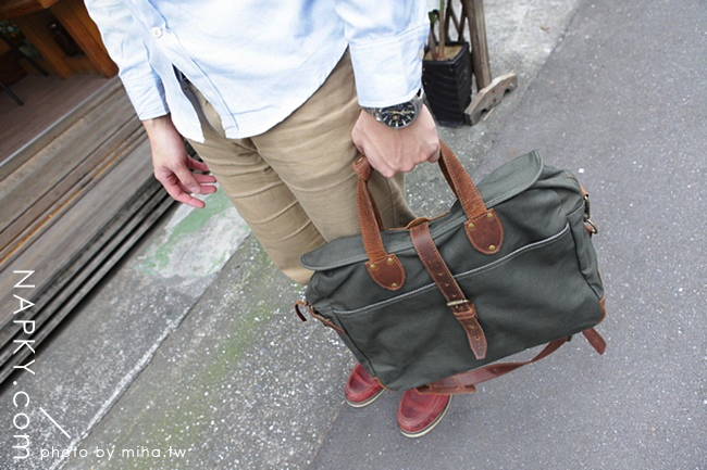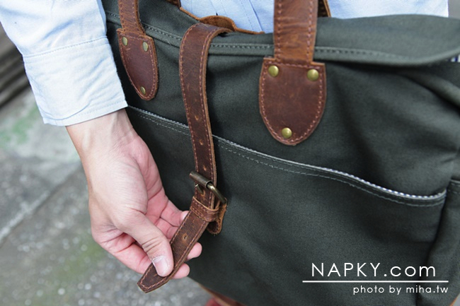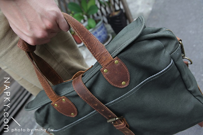 一拿到他的時候,說真的還有點重耶!!但質感可是好的沒話說,因為他用的是防潑水上蠟重帆布,才可以讓包包挺立有型,不會放著就癱軟鬆垮垮的