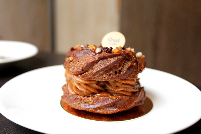 巴黎布列斯特 (Paris Brest),可是流傳百餘年的經典甜點,起源於 1891年從法國巴黎往返布列斯特長達一千兩百公里的自行車比賽,當時的甜點師看見轉動的車輪而得到啟發,製作出螺旋狀的夾心泡芙。Oui Cafe 的巴黎布列斯特裡面是榛果巧克力內餡,整體吃起來有顆粒感,甜,但是不膩口,到底 Denis 的秘訣在哪兒?讓人總是一口接一口的消滅掉這種沒有罪惡感的甜味!