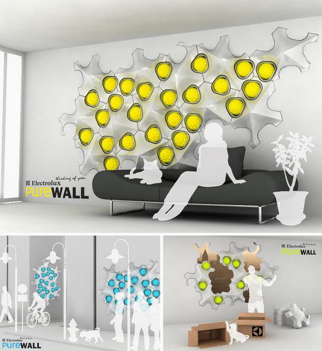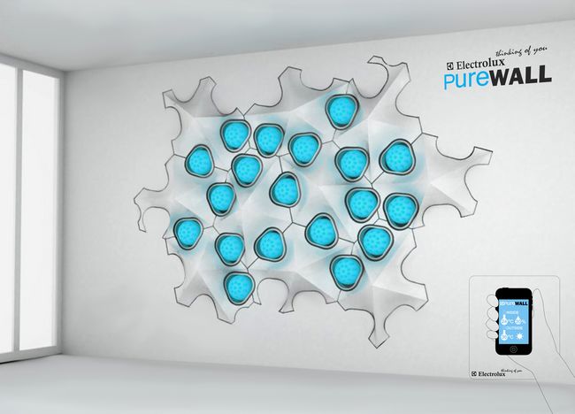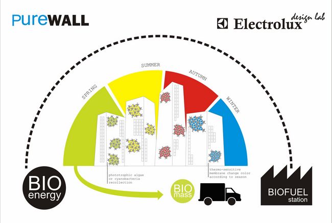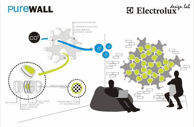 PUREWALL 是一種的模塊化的無污染過濾結構,它由含有藻類或藍藻纖維囊,過濾二氧化碳轉換為氧氣,在濾波處理之後,藻類其轉化成生物質,可回收和處理,以獲得生物能源和燃料,也可以作為一個建築裝飾面板,提供清新的空氣和舒適的視覺感受,根據溫度和四季節變色,創造出美麗的環境。