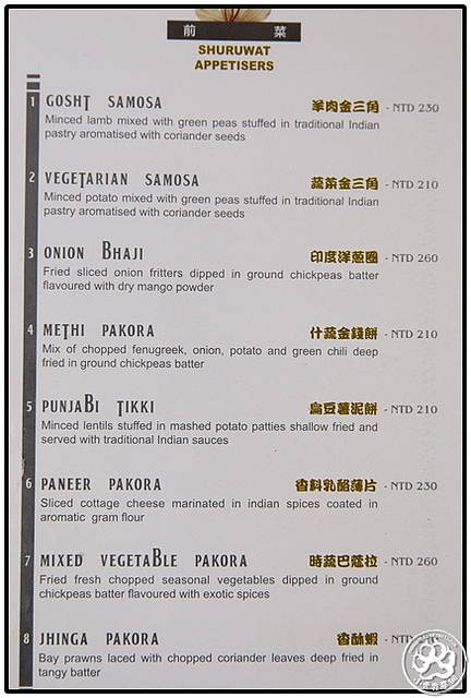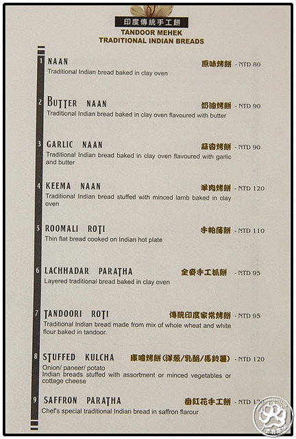 烤餅一直是印度菜的主食,不管是單吃還是拿來沾各式各樣的醬料、甚至是咖哩雞等醬,但說真的當天我們叫了一堆餅,不同的名字、不同的口味,最後雖然我也拍了MENU和帳單還是對不太上來,所以接下來就以整體性來論,反正餅就餅(笑)。