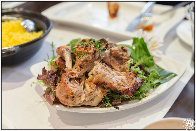 傳統窯烤雞腿。它吃起來仍是滿滿的香料味,之不過其香料之味和剛剛有所不同,也許是經過烤和雞油的催化讓這香料得以釋放,但這香料味卻的快也去的快。雞腿肉方面不像看起來的乾,吃起來還算軟嫩帶點輕咬勁,吃上一兩塊是還OK,再多吃就有一點偏油味重,幸好旁邊搭著一些帶著微苦的生菜可以轉換味覺。