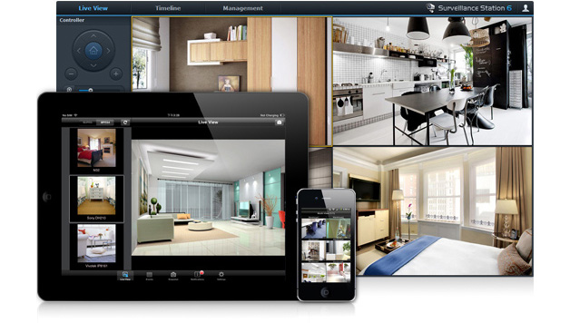 但以目前的NAS來說,軟體上都有支援一台以上的IP攝影機共同使用同一個網路位置,也就是你安裝在家中各處的IPCAM所拍攝的畫面,都可以透過與NAS連結,整合在一個軟體畫面裡。當然透過NAS所整合的畫面,你都可以經由行動裝置(智慧型手機、平板電腦、筆電)來做監視。有了整合式的畫面後,你一次就可以看到所有攝影機來看看每個角落有沒有異常狀況,如果有異常就可以直接點開觀看。