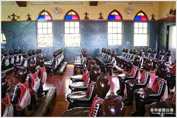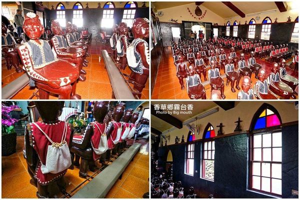 ▲靠近一看原來這是以木頭雕刻而成的人形椅子! (這裡也是霧台第一棟水泥建築(1959年),受到教會在地化浪潮影響,聖心堂內有穿著魯凱族頭飾、服裝的耶穌像,結合神話的圖騰等等。)