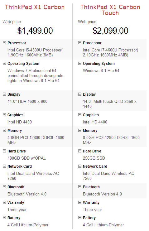 New ThinkPad X1 Carbon搭載14.0吋2560 x 1440解析度螢幕(10點觸控),另有1600 x 900款(無觸控)可選擇。高階款處理器使用Intel Core i7-4600U Processor( 2.10GHz 1600MHz 4MB)、一般款搭載Intel Core i5-4300U Processor( 1.90GHz 1600MHz 3MB)。這次最令人期待的還是他輕薄又強韌的外觀設計,重量上大約只有1.28KG,在14吋筆電中應該是數一數二的輕;厚度上也僅有1.78 CM,這樣的外觀設計下,居然還通過嚴格的軍規測試,包含灰塵、振動、高溫、低溫、海拔高度、水和濕度。這是因為採用了太空技術的碳纖維所打造,所以可以如此堅韌。其他規格部分請參考下表。