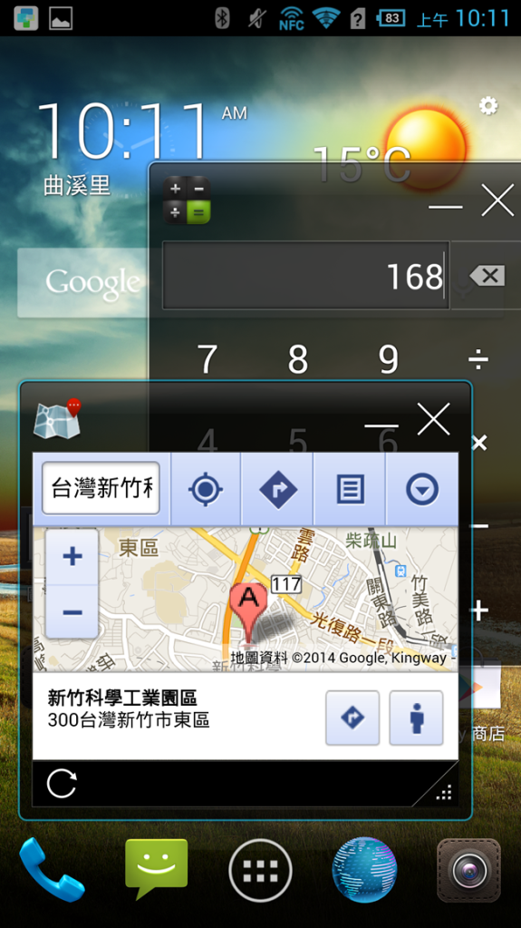 不論在什麼情況下使用手機,來電的通話畫面皆不會整個遮蓋掉正在使用中的手機畫面,非常方便。像這樣同時在一個桌面開個計算機和地圖都沒什麼問題~