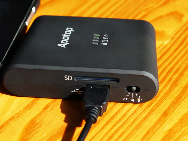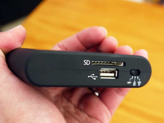 正面有四個燈號指示,從左到右分別代表著行動電源、SD卡、Wi-Fi、電源指示。