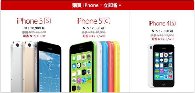 在iPhone 部分是從5S到4S 通通都有NT$1,520的優惠折扣價。