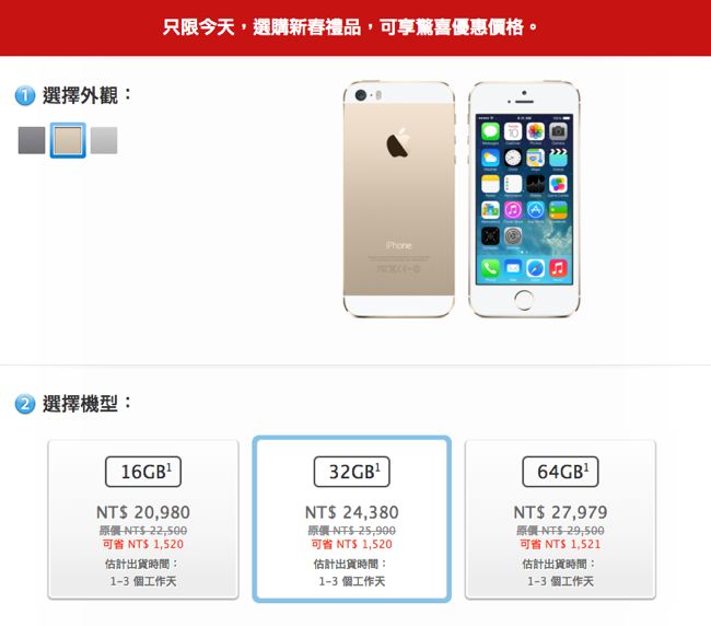 其中甚至連最熱門的5S 金色也有參與折扣推出,並且送貨日期僅需要1-3天。