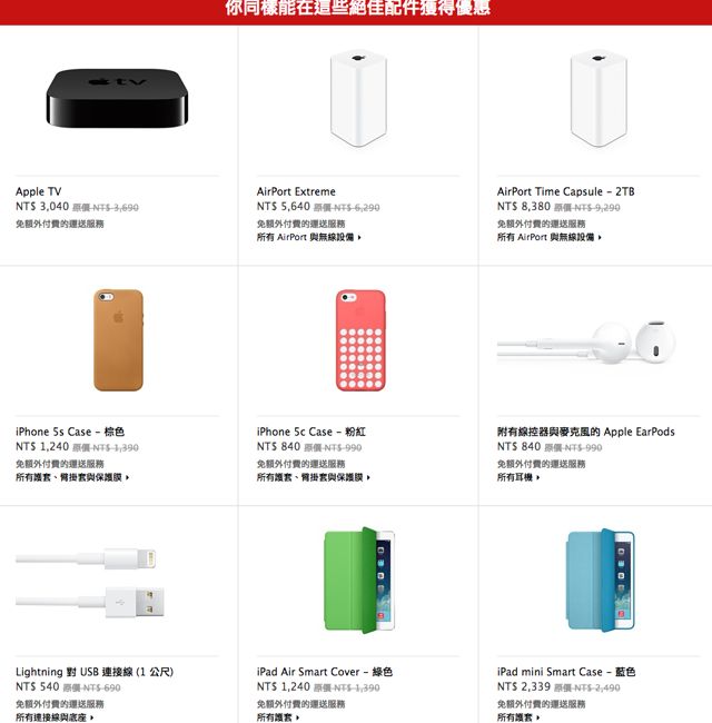但更讓人期待的應該還有這些平時讓人想買又捨不得買,可以有,但沒有也沒關係的配件吧?不論是耳機、連接線、或是平板的smart cover 甚至連Apple TV 與AirPort Extreme也都有參與這次折扣日!