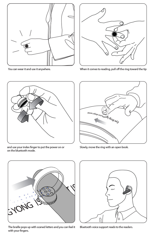 這款戒指的操作很簡單,只要先轉動戒指周圍的旋轉開關將感應開啓,接著把戒指表面所安裝的掃描感測器對著書本進行掃描,便能夠透過內建的翻譯系統來將所掃描到的文字轉換成盲文的點字,而盲人朋友就能由戒指背面所設計的點狀物在手指觸碰來明白翻譯後書本上的文字內容。