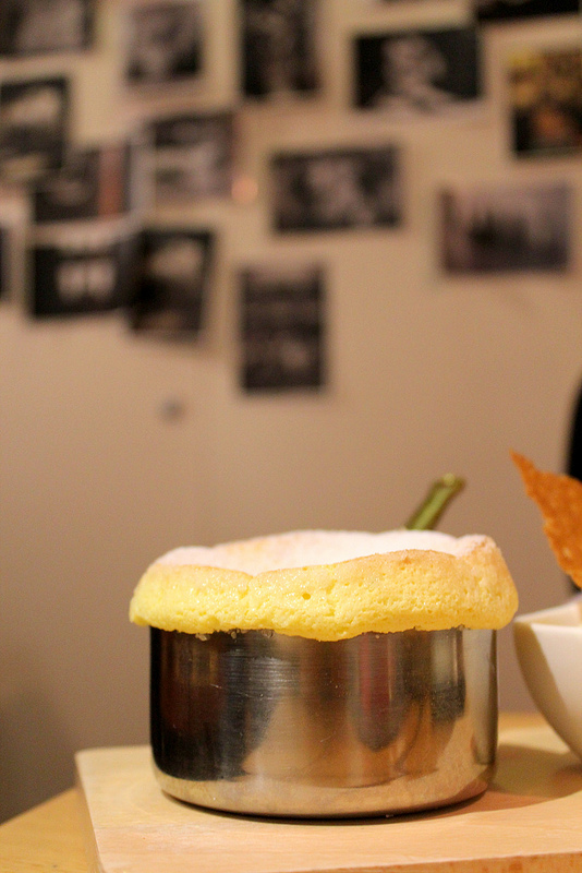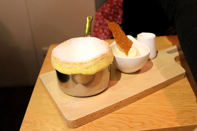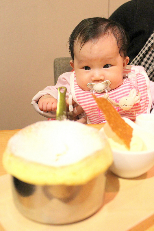 原來用小銅鍋裝著直接上桌的舒芙蕾,佐上冰淇淋和脆餅還有香草醬,是道要在三十秒內拍好照片的夢幻甜點唷!