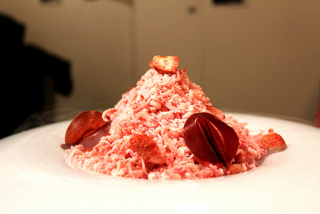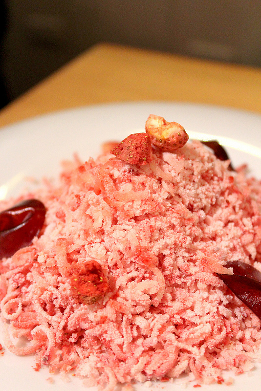 草莓季已經來臨,雖然天氣有點冷,但是這道用上分子料理概念的「草莓狂想曲」實在很有意思,用液態氮急速冷卻後的草莓冰屑,加上新鮮草莓、乾燥草莓、草莓慕斯醬,也就是把不同型態的草莓通通集合在一起。