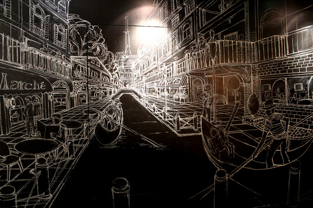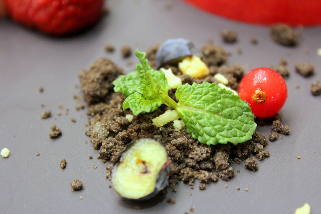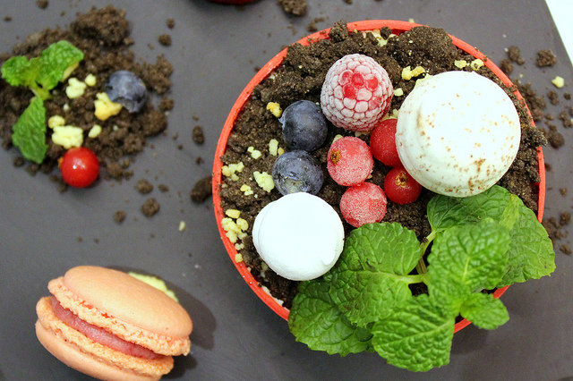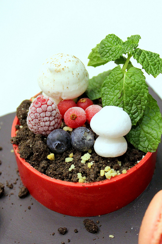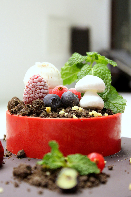 利用黑色石板盛裝,巧妙的利用巧克力碎屑偽裝成土壤,新鮮的薄荷絕對是少不了的欺敵戰術,微烤之後的糖霜簡直是個真假難辨的蘑菇,新鮮的藍莓、覆盆子、野莓就像是讓人無意間踏進了甜點森林中的小花圃,不禁要打量一下,看有沒有小矮人躲在馬卡龍或是草莓的後面在偷偷看我們。