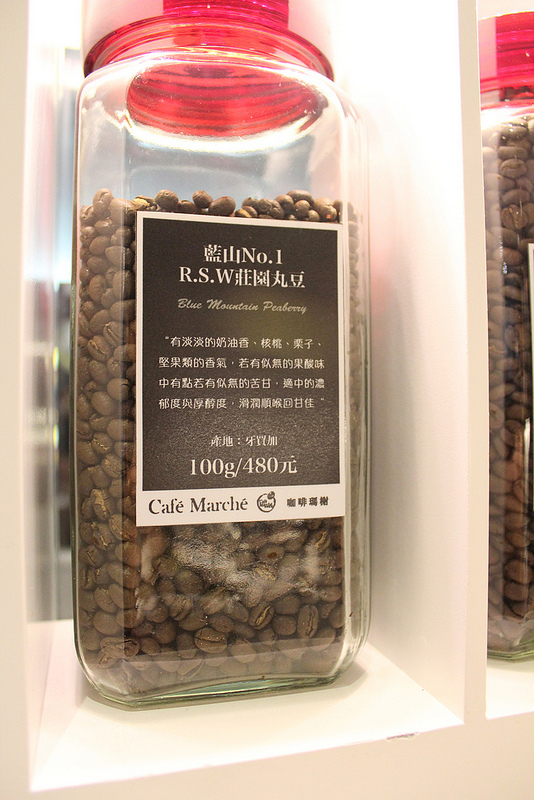 同時, 咖啡瑪榭忠孝店在密封罐外也清楚的標示出咖啡豆的產地與風味描述,讓消費者能夠很快的知道產品特性,也讓新進員工在介紹時不會辭窮。依照種類的不同,每一百公克的售價在 140~220元左右,單價最高的是牙買加藍山丸豆。