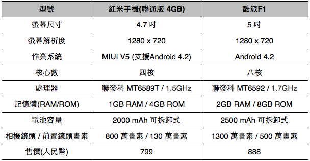 而對岸的手機大廠-酷派(Coolpad) 也在一月中推出了這款全球第一支在千元手機內擁有八核心的 F1。簡單看一下F1 的硬體規格,5吋 1280 x 720 螢幕、使用聯發科 1.7GHz 八核心處理器、2GB RAM 與 8GB ROM、可透過 Micro SD 擴充至 32GB,就連在電池方面也有 2500mAh 可拆卸式電池。整體來說硬是比 4.7吋、四核處理器、1GB RAM與 4GB ROM 的紅米效能強勁。拍照方面相機鏡頭更是高達 1300 萬畫素,前置鏡頭也有 500萬畫素的驚人數字。