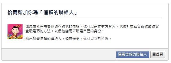 被設定完成的臉書朋友,會收到被加為信賴的聯絡人通知。