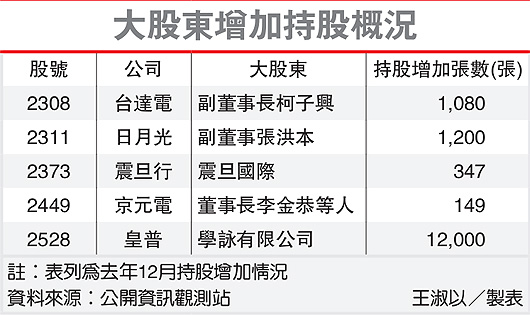 其中,京元電董事長李金恭小幅回補,台達電副董事長柯子興持股增加1,000多張,震旦行則透過震旦國際加碼自家股票。