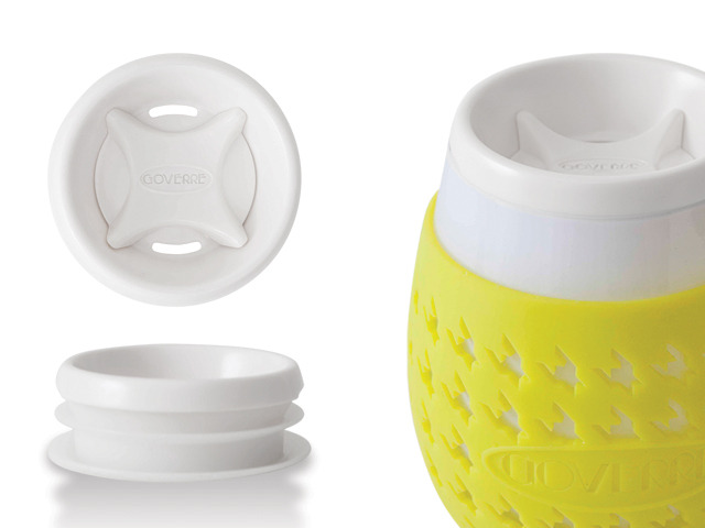 GOVERRE 由三個部份組成,蓋子是獨特和創新的防濺蓋,是由雙酚A / BPS和無鄰苯二甲酸酯聚丙烯(PP # 5 )材質,但各國對這些原料規範有不同的認知與管制,使用上還是要注意。酒杯最內層是玻璃製作,保留了酒的味道和完整性,比典型的酒杯更厚且耐用,最外層是有顏色的矽膠套,它可以防止熱傳遞,並有一個無防滑手柄。