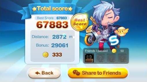 好友串聯排行榜:可與通訊錄中所有WeChat好友進行排名比賽,當玩家創下個人最新紀錄,可即時在好友個人、群組對話窗中、或個人WeChat朋友圈上邀請好友們來挑戰!