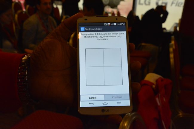 這次在Knock code 上,LG G Pro 2 是使用四個區塊來設定敲擊數開啟螢幕解鎖。現場的喚醒速度也是相當快,在去年推出Knock On 來輕敲螢幕兩下後喚醒功能的LG,這次針對Knock 功能再度發揚,也算是LG 走出自己的專屬特色了吧!