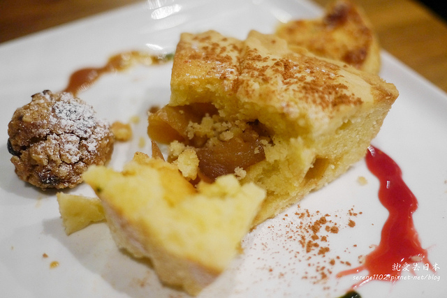 服務生會先問蘋果派灑或不灑肉桂粉,右上說當然要囉!肉桂粉非常能夠把蘋果派的香味拉出一股濃郁感,加上這派裡的蘋果是煮得又香又還留有一點濕潤潤的口感,實在很正點。