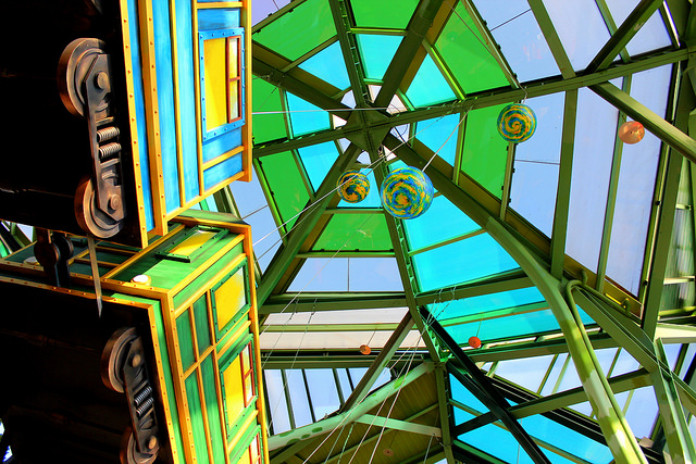 原本的丟丟噹森林廣場是由黃聲遠建築師所設計,高達十四公尺的鋼構巨樹在日光下投射出絢爛繽紛的色彩,一走出宜蘭車站就會被它吸引住目光,而旁邊的紅磚屋更是日治時期所遺留下來的歷史建物,現在作為百果樹藝文空間使用。