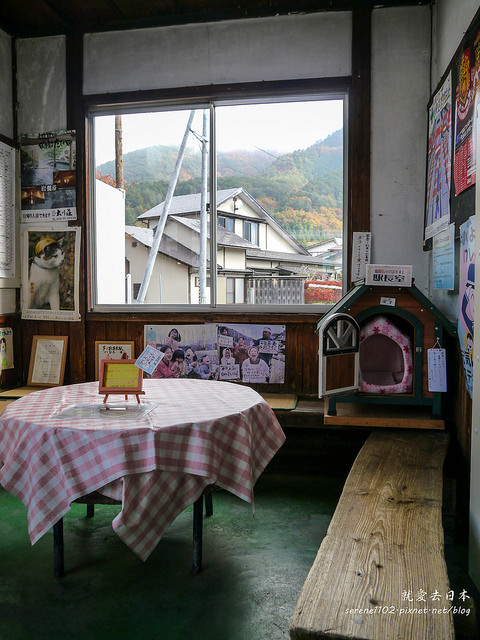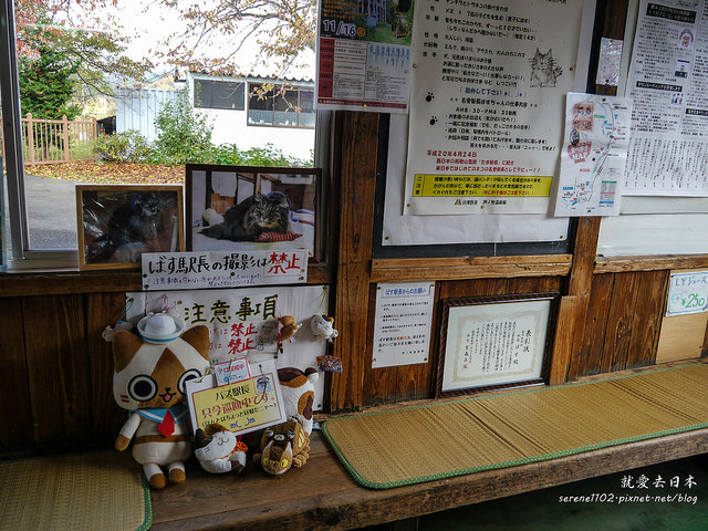 站內貼了許多貓站長的圖片和玩偶,以及各式各樣的告示請來參觀的遊客,不要對著站長拍照。