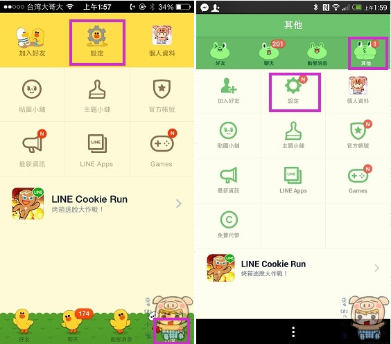 當您收到邀請之後,如果是沒有安裝的遊戲,請您先安裝,並連動LINE,接著點選「其他」再點選「設定」(左邊為iOS畫面,右邊為Android畫面)