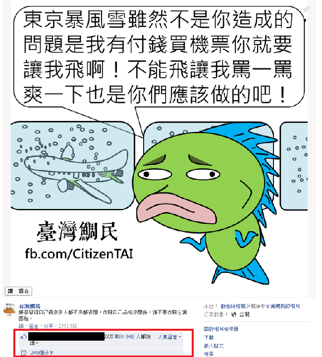 月月:我的感想就是,媒體的傳播力很巨大!在大爆發的前幾天,我們有一天只收到13個讚的時候,所以當時是蠻懷疑自己的路線的。而當時在畫成田機場的事情的時候,其實完全沒想到過他會爆紅,所以就是很平常心的去做平常我會做的事情而已,沒想到事情最後變得那麼大,然後「台灣鯛民」四個字被媒體拿去用,突然知名度大開,坦白說是完全始料未及的。