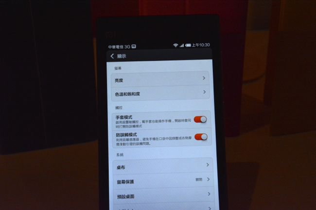 手機特色部分,這次小米3使用LG 與 SHARP的螢幕,使用者只要開啓手套模式後,不管是濕的手或是帶著手套,都可以直接在螢幕上進行操作。 DSC_0069 DSC_0072