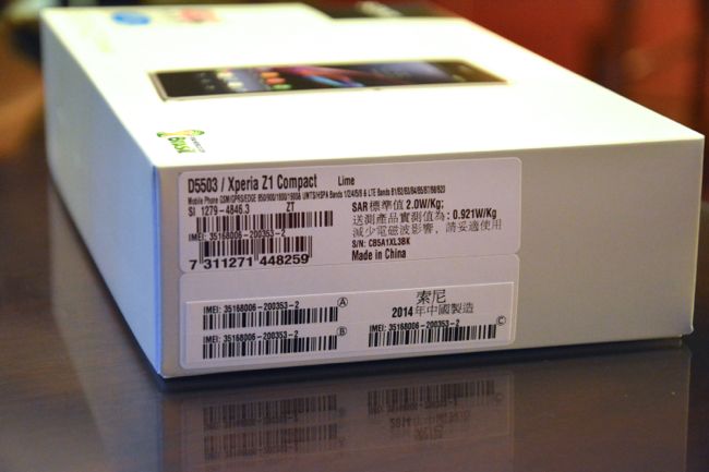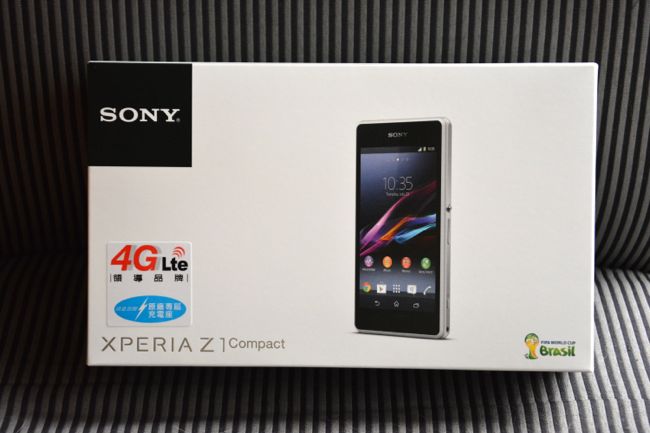 詳細的功能規格,在先前發表會文章中也介紹過了,這邊我們就直接來個熱騰騰的開箱吧!從外盒上可以看見大大的 4G LTE 字樣,這款 Z1 Compact 也是Sony 首款支援 4G LTE 的手機。不過其實右下角那個巴西的世界杯足球賽贊助logo其實更引人注意呢!
