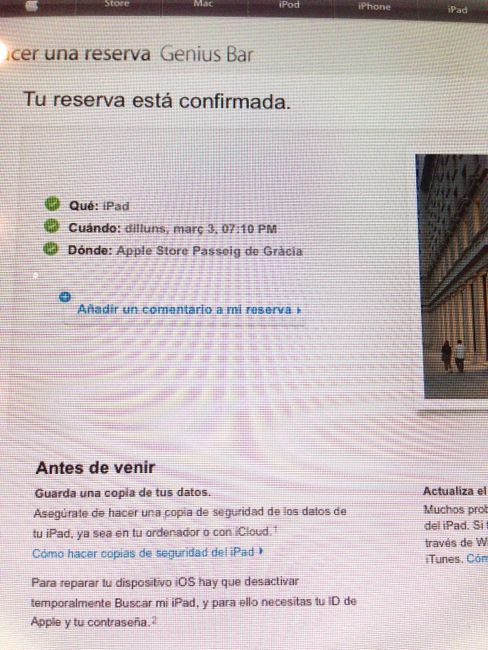 在透過身穿藍色衣服 Apple員工的說明後瞭解,原來有iPad、iPhone、iMac 等相關維修問題的朋友,必須先透過網上預約服務,像這邊是www.apple.com/es/passeigdegracia 來進行預約,而這預約動作也可以在店中任何一台 iPad 上由 Apple 人員為你進行步驟操作,絲毫不用擔心網頁語言看不懂的問題。