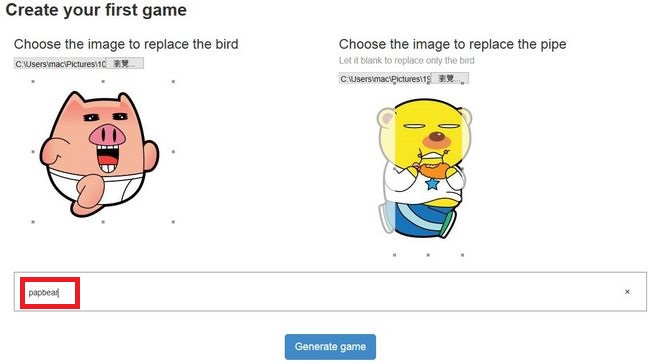 Flappy Generator的自製方法非常簡單,與 “Flappy Bird"一樣,有小鳥及水管,左邊的選取是代表小鳥圖片,右邊是水管圖片,最下方空格處是自訂遊戲名稱的欄位,之後就會帶出自己的專屬命名網址。