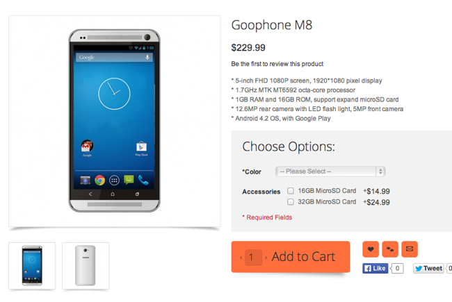 根據官網說明,這款Goophone M8 有著5″FHD 1920 x 1080解析度螢幕、使用1.7GHz MTK 6592 八核處理器、搭載了1GB RAM/ 16GB ROM以及 1260 萬相機畫素與500萬前置鏡頭,並且使用Android 4.2 作業系統。更令人吃驚的是售價僅有 USD 229.99 (約為台幣 6,972元)。