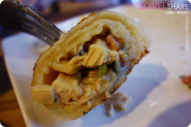 外頭是類似QQ可麗餅皮有點焦香,裡頭塞了煙燻雞肉跟蔬菜還有美乃滋,這好好吃!一上桌就被大家分時光,蠻特別的外面也沒看過的菜色,實在好好吃,份量也夠,一人吃的話算有飽足感。