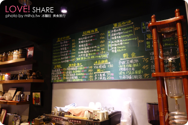 吧台後的黑板滿滿寫著賣的咖啡種類,還有一些輕食,咖啡還是主軸,食物類不多。
