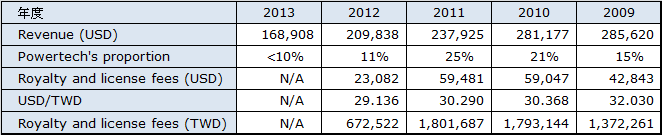 對照兩張表格,2009 ~ 2012 年,力成合併年報揭露支付的權利金,略高於 Tessera 年報,可能是因為 Tessera 年報中,將力成、聚成分成兩家公司計算,而在力成合併年報中,兩家公司會合併計算的緣故。但整體來說,兩家公司揭露的金額,是經得起交叉驗證的,數據大致相符,沒有隱瞞造假的問題。