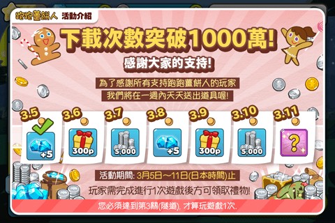 活動日期:3月5日(星期三) 至 3月11日(星期二) 活動辦法:於活動期間每天登入「LINE 跑跑薑餅人」,玩家即可免費獲得水晶、錢幣、禮物點數等每日獎勵,並推出一千萬紀念神秘禮物!